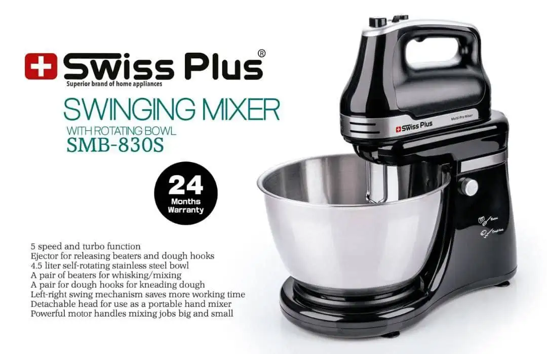 همزن سوئیس پلاس مدل SMB-830S محصولی با طراحی ساده و کاربردی است که در کنار توان مصرفی پایین، عملکردی مناسب دارد.به کمک دو عدد پرهی همزن از جنس استیل ضدزنگ و کاسه مخصوص با ظرفیت بالا، کاربری آسانی دارد. همچنین توان مصرفی نسبتا پایین، خمیرزن و امکان تنظیم سرعت از قابلیتهای ویژهی این محصول بهحساب میآیند. دارای تنظیمات سرعت در چند حالت و نیز دکمهی توربو است. دکمهی آزادسازی میلهها نیز روی دسته قرار گرفته است. میتوان دستگاه همزن را از پایه جدا کرد و به صورت جداگانه از آن بهره برد. میلههای همزن هم همراه این مدل عرضه میشوند که برای خمیرزدن کاربرد دارند. پایههای ضدلغزش دستگاه مانع از لرزش و جابهجایی آن حین فعالیت خواهند شد. گفتنی است که این مدل در کنار عملکرد توربو، از قابلیت شستوشوی کاسه در ماشین ظرفشویی بهره میبرد.